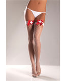 Doctor, doctor! Be Wicked's Lycra Industrial Fishnet Thigh Highs with White Crosses on Red Bows are a stunning addition to your favorite naughty nurse outfit. These sexy fishnets are sure to get your partner's blood pumping. Size OS, 6-12.