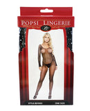Lure in your lover with this sexy plus size bodystocking featuring a scoop neckline, sheer fishnet cups, rhinestone-studded accents, fitted long sleeves, an open crotch panel, a scoop back, and an over the toe style. (Thong not included.) Material: 95% Polyester. 5% Elastic. OS: Height 5ft - 5ft 10inches. Weight: 100-185 lbs.