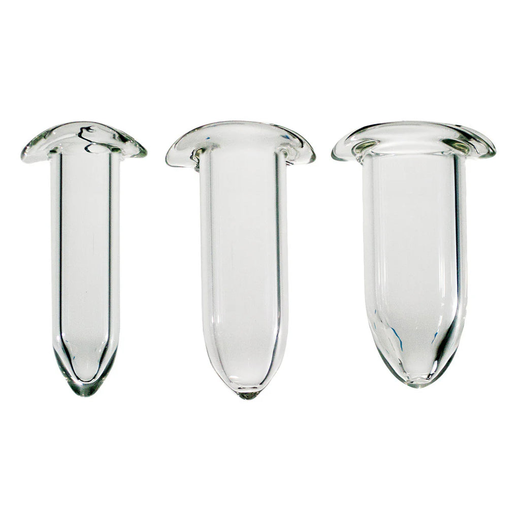 Set of 3 graduated glass dilators specially designed to be worn comfortably for longer periods of time during treatment of various kinds of sexual issues or during the process of sexual reassignment. Handcrafted in the USA from high quality extra heavy walled Borosilicate glass tubing, every set comes protectively packaged in a custom, handmade, three pocket, padded brocade pouch.
