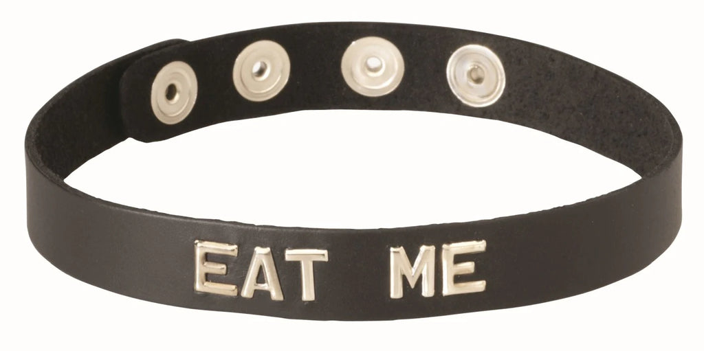 Leather Word Band Collar Eat Me from Spartacus Leathers. Choose a word band collar that suits you and your play! high quality oil tanned leather. .75 inch wide leather strap adjustable from 13.5 inches to 16.5 inches. Hand made in USA for over 30 years by Spartacus. Collar is an intimate, visually erotic accessory. Spartacus word band collars are handmade by skilled craftsmen using quality oil tan leather. Snap setting for 13 inches, 14 inches, 15 inches and 16 inches. Spartacus collars are handmade by skilled USA craftsmen using quality oil tan leather. Narrow band with four adjustable metal snaps. Nothing arouses the senses like leather. The Word Master is also in silver. Fulfill your strongest desires! Make a statement without saying a word with this sassy leather collar. The comfortably slender band comes with four adjustment snaps to ensure a snug fit, and features a sassy saying in silver-tone letter studs along the front. Perfect for a night at the club or a hot and heavy BDSM scene in the bedroom, this naughty collar will ensure all eyes are on you! Color Black. Material Leather. Word Collar Eat Me. Closure Snaps. Special Feature Adjustable snap setting for 13 inches to 16 inches. Fetish wear. Naughty role playing gear. Spartacus Leathers A Passion for Quality Catalog. Milwaukie, Oregon. Made in the USA. 2022.