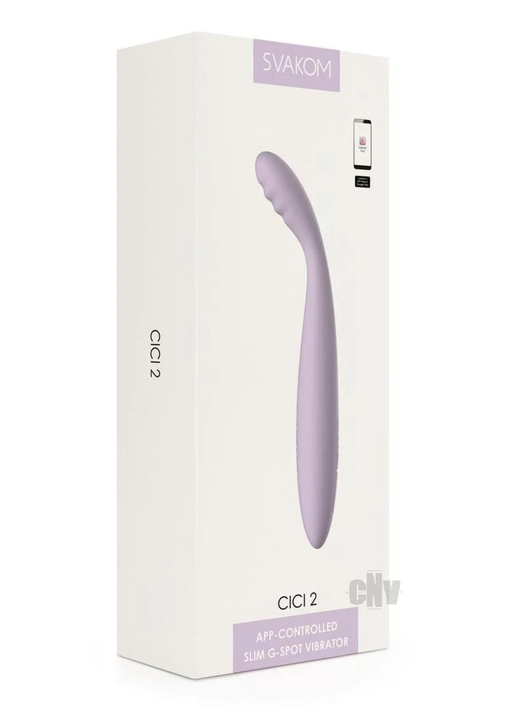 CICI 2APP-CONTROLLED INTERACTIVE RABBIT VIBRATORMeet Cici 2. SVAKOM`s app-controlled slim g-spot vibrator is an upgraded model of the best-seller, Cici. Make your G-spot glow with the ultra-slim, ultra-strong Cici 2. Cici 2App-controlled Slim G-Spot VibratorMade from soft-touch liquid silicone, Cici 2`s ribbed head is precisely angled to target your G-spot while its shaft flexes with you. Its slim design is perfect for bodies with a vagina who are newto vibrators, returning from sexual inactivity, or prefer a narrower shaft. You can also use thehead for external stimulation and activate the sensual heating function. Then, get adventurouswith customized vibrations, long-distance control and partner play. Simply pair Cici 2 with theSVAKOM App on a Bluetooth-enabled smartphone. Vibration and HeatingCici 2 boasts vibrations in 5 modes and 5 intensities, plus a heating function, which warms theshaft head to body temperature of 38°C to increase relaxation and arousal. Memory Function and Travel LockCici 2 lets you pick up where you left off as the memory function resumes on the last mode used.It also features a travel lock to prevent accidental turn-on in between sessions. Waterproof USB ChargingUse the battery indicator as a reminder to recharge Cici 2 via the USB port, which has aprotective dust cover. Thanks to the waterproof design, you can also enjoy easy cleaning andaquatic action.