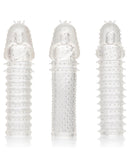 The 3 Piece Extension Kit is a set of 3 super tight, close-end extension sleeves with a ribbed texture inside and out for intense stimulation. These enlarging enhancer sleeves wrap tight to increase girth, length and explosive pleasure for everyone involved. The erotic enhancer sleeve's ultra-stretchy material and spacious chamber is made to fit even the biggest man. While you thrill your lover with increased girth and stimulating ticklers, the fulfilling enhancer's powerful erection support and textured chamber result in explosive results for both of you. The textured chamber and erection enhancer provide increase stimulation and powerful support. Wrap your pleasure tool in this super stretchy sleeve to easily increase stamina, stimulation and orgasmic pleasure. Color: Clear Material TPR Measurements : 6" x 1.5" / 15.25cm x 3.75cm (Sleeves)