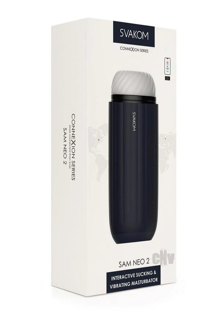 SAM NEO 2INTERACTIVE SUCKING andamp; VIBRATING MASTURBATOR andbull;Independent suction and vibration create powerful andlsquo;blowjobandrsquo; sensations.andbull;Use the andlsquo;Extended Oandrsquo; function to reduce intensity for a longer orgasm.andbull;Pair with the SVAKOM App for extra solo and partnered play options.andbull;andlsquo;Feelandrsquo; adult video content or earn tips by using your toy via webcam sites. Stronger suction, longer climax. Sam Neo 2 uses powerful suction and vibration while the thick textured sleeve massages your penis for your best-ever andlsquo;blowjobandrsquo;. Thanks to the clever andlsquo;Extended Oandrsquo; function, your orgasm will last even longer! Pair Sam Neo 2 with the SVAKOM App for more play options, FeelConnect 3 App to sync with adult videos or FeelPerformer to star on cam sites. Extra features: USB-recharging, battery indicator and travel lock.