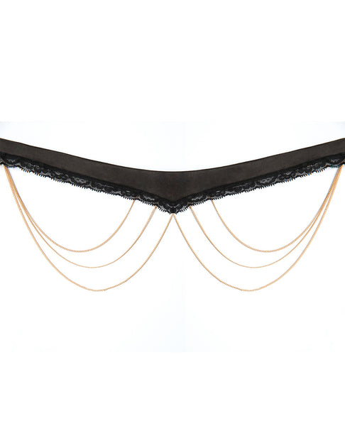Complete your flirty look with this black satin headdress featuring a black lace trim, satin ribbon ties, and three draping gold chains. (Headdress only.) Fabric: 90% Polyester, 10% Spandex. From OHlalacheri.