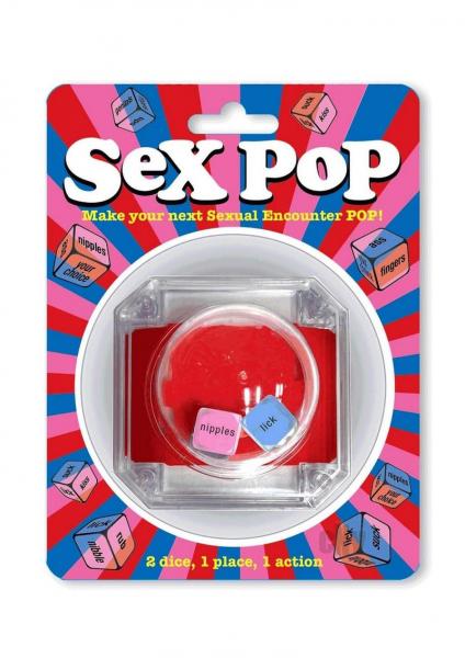 Sex Pop is a fun popping sex dice game for partners wanting to add variety and spontaneity to their sexual playbook. Each popping dice game contains one ACTION dice (Rub, Lick, Suck, Kiss) and one BODY PART dice (Nipple, Fingers, Lips, Ass). Each player takes a turn popping the dice to reveal the sexual act to be performed on their partner. This fun and sexy game is convenient and compact enough to take on vacation or keep handy in your nightstand drawer.