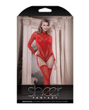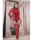 Sheer Infatuation Long Sleeve Teddy w/Attached Footless Stockings Red O/S